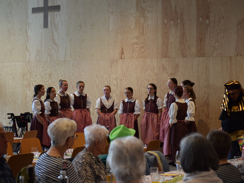 Was auf den 11. Februar als Treff für Senioren angesagt wurde, entwickelte sich, im unweit der Jugendkirche gelegenen neuen Saal, schnell zu einem Jungbrunnen für die geladenen Gäste der älteren Generation. Der neue Saal bestand bei dieser Gelegenheit auch die Feuertaufe. Nach den herzlichen Begrüssungsworten unseres Pfarrers Pater Basil wuchs der Anlass unter den gut hundert, zum Teil kostümierten Gästen alsbald zu einem stimmungsvollen Nachmittag. Eine Gruppe engagierter Frauen, verkleidet als Hudi, eröffnete den Nachmitttag mit frohem Gesang. DJ Örwein heizte die Gästeschar in der Folge mit Musik-CDs zudem an, sodass sich eine tolle Fröhlichkeit im Saal breitmachte. Die gesangsfreudigen «Hudi» stimmten mit Begeisterung ein. Ergänzt wurde dies mit einer spontanen Polonaise durch den Saal. Auch waren im Begleit schnell unterhaltsame Gespräche mit den jeweiligen Tischnachbarn gefunden, die Dorfgemeinschaft in solcher Art aufzeigend.